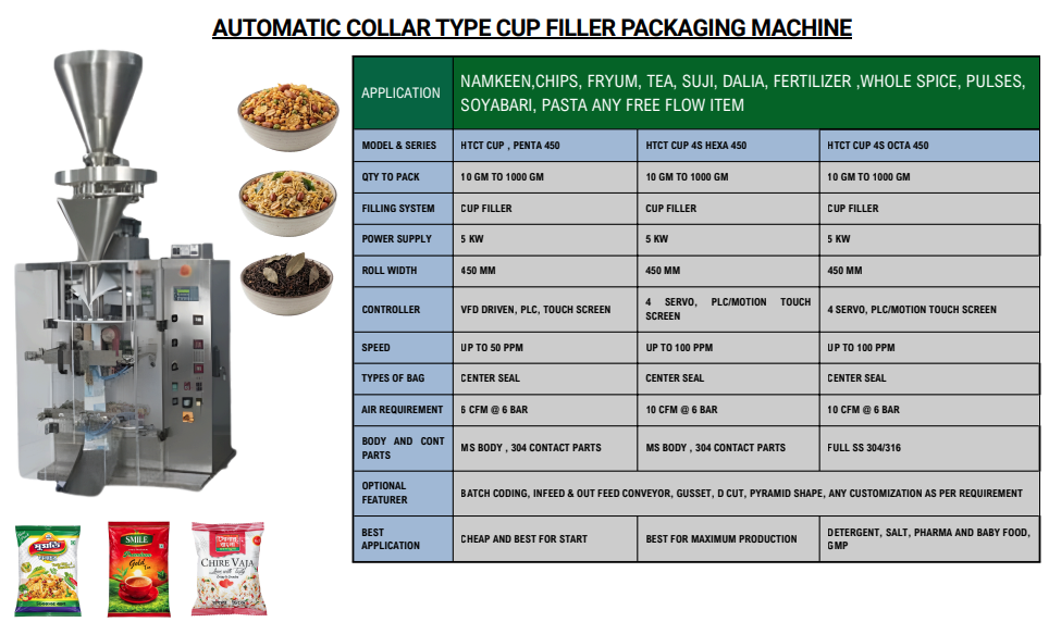 Automatic pouch packing machine apt for mechanical cup filling machine product-namkeen,chipes,basen,sattu, etc.The fully automatic form fill and sealing machine is an intermittent machine designed for the efficient packing of product in seal pouch upto 250gms The machine is versatile and can be easily changed over from one pouch size to another vertical seale.