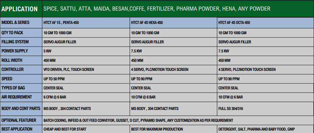 APPLICATION: SPICE, SATTU, ATTA, MAIDA, BESAN, COFFE, FERTILIZER, PHARMA POWDER, HENA, ANY POWDER